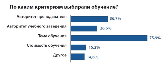 Ключевым критерием при выборе обучения для бизнес-тренеров является тема (75,9%), на втором месте стоит авторитет преподавателя (36,7%), а на третьем – авторитет учебного заведения (26,6%).