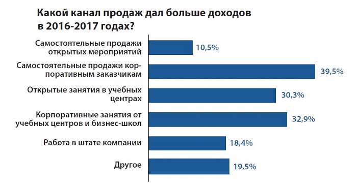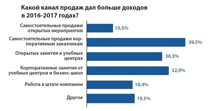 Больше всего доходов преподавателям приносят следующие каналы продаж: самостоятельные продажи корпоративным заказчикам (39,5%), корпоративные занятия от учебных центров и бизнес-школ (32,9%), открытые занятия в учебных центрах (30,3%).